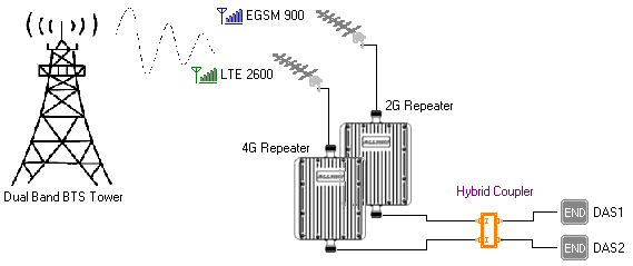 Hybrid couplers are designed to combine two wireless carriers to a single antenna feed or cable. This requires the termination of one output port in 50 ohms, and results in a 3 dB loss in each signal. In situations where two similar feeds are required both outputs may be used, eliminating the need for a termination.
