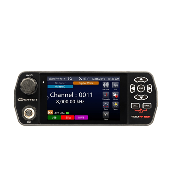 The 4050 HF SDR transceiver desk console controls a connected 4050 HF SDR either via direct connection as a primary or secondary control head or via IP network (Ethernet or WiFi). It has a built in speaker, detachable boom microphone and supports standard headsets and PTT (push to talk) foot switches.
