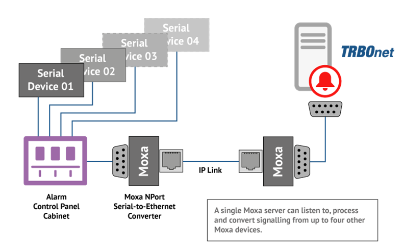 The Alarm Management high-level diagram shows available event sources and response targets. The choice of event sources is not restricted to your MOTOTRBO radio network, such as radio calls or text messages. Your TRBOnet Server is able to receive and react to information from third-party software and hardware. TRBOnet can be integrated with many enterprise operations management systems that can feed essential data into TRBOnet via TCP/IP or a serial port. The application supports a number of protocols including Modbus, RS232 and ESPA 4.4.4. The diagram below shows how an alarm control panel can be connected to TRBOnet using Moxa devices.